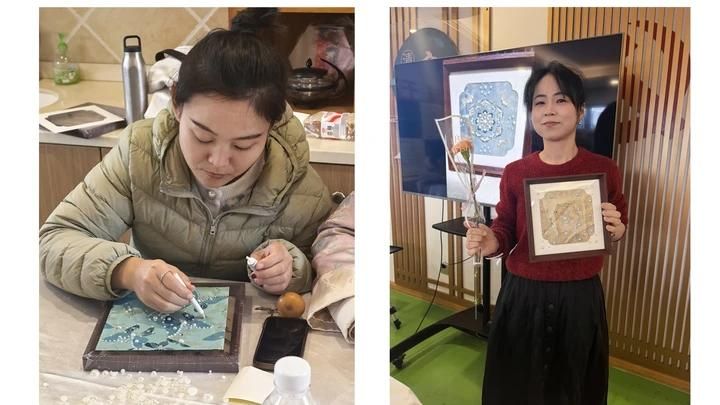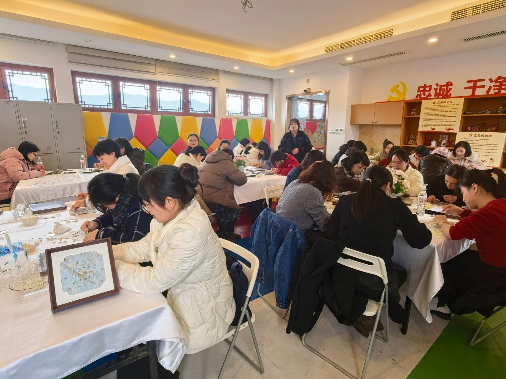 手工环节以宋锦珍珠画为载体,将非遗文化与美学体验巧妙融合。活动现场,大家认真聆听专业老师的讲解、细心操作,以锦为底、以珠为墨,指尖轻捻,将一颗颗莹润珍珠精心点缀于雅致宋锦之上。创作过程中,老师们相互交流、彼此协助,在专注创作中感受传统工艺之美,在静心手作中释放压力、陶冶情操。