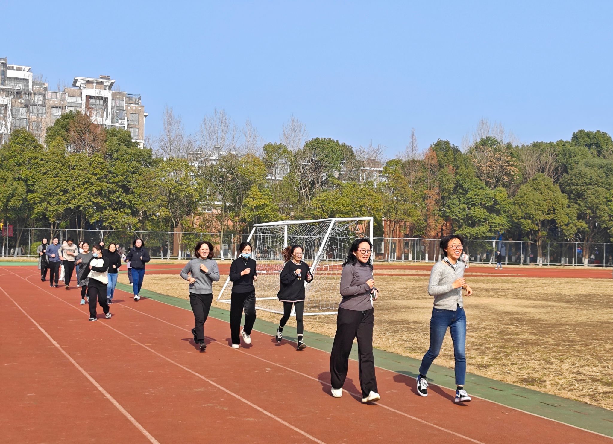 随着院长何军邀的发令——“预备、跑”,老师们冲出起跑线,沿着计划路线前进,用轻快的步伐展示他们的健康活力,冬日的校园瞬间被老师们的热情点燃。一时间,欢声笑语让整个体育场洋溢着温馨快乐的气息,跑步队伍成为一道亮丽的风景线。