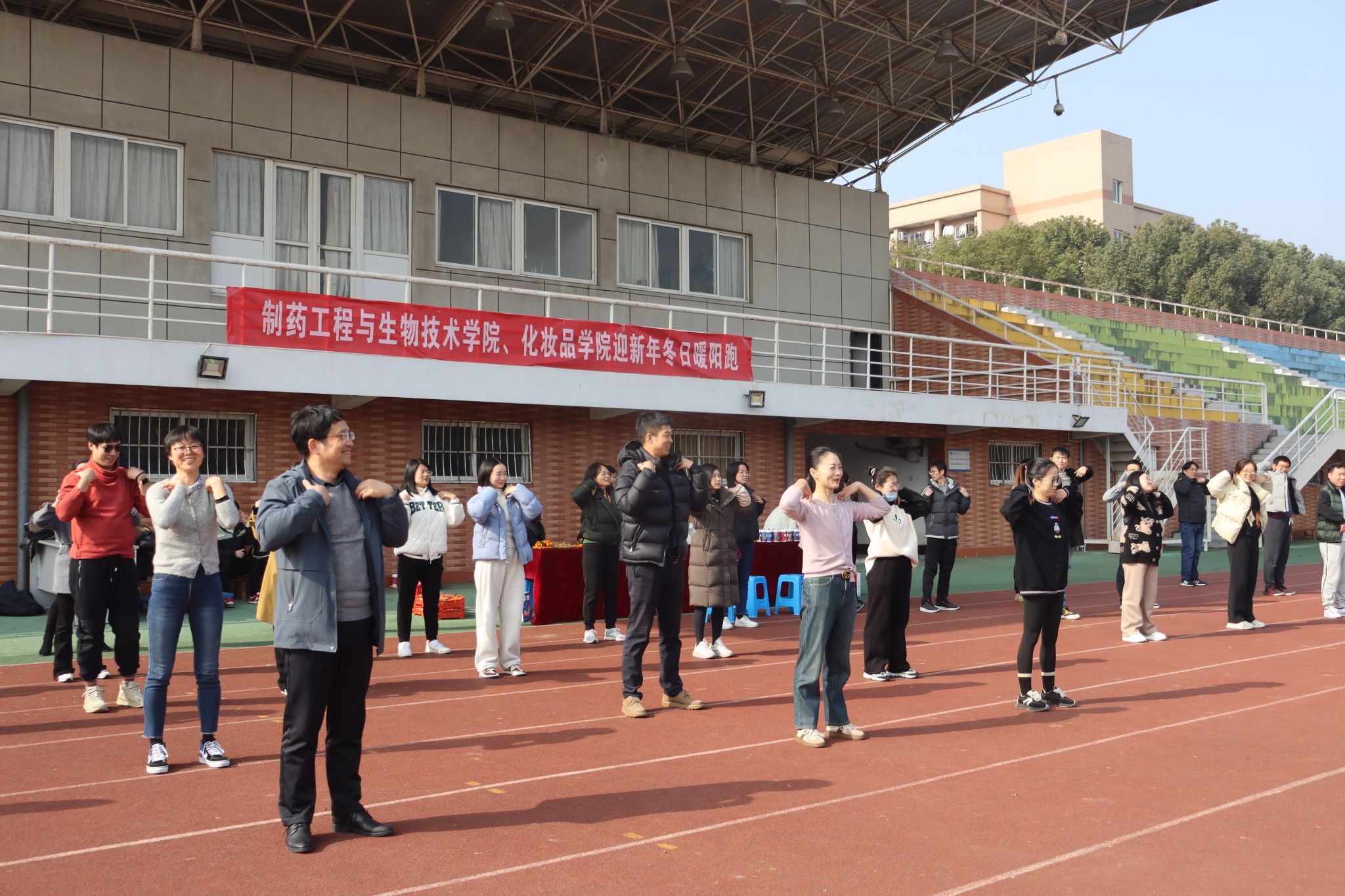 12月29日下午,制药工程与生物技术学院、化妆品学院全体教职工齐聚鄞州校区体育场,参加由学院分工会举办的教职工迎新年冬日暖阳跑活动,以这样的方式迎接新年的到来。